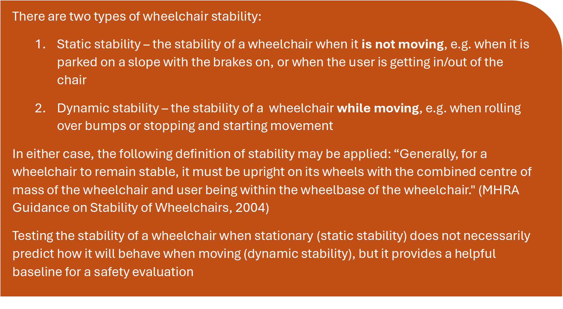 MHRA Guidance on Stability of Wheelchairs (2004) ‘Guidance on the stability of wheelchairs’ MHRA DB2004(02) - https://unece.org/fileadmin/DAM/trans/doc/2004/wp29grsg/GRSG-ig-access-03-10.pdf accessed 11/07/2025
